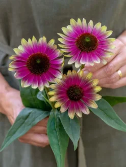 Watermelon-colored petals with juicy pink centers and lime green tips sweeten borders from summer into fall. Bees and butterflies find the bright red-orange cones irresistible! The plant’s compact habit makes it a perfect fit for smaller gardens.