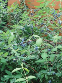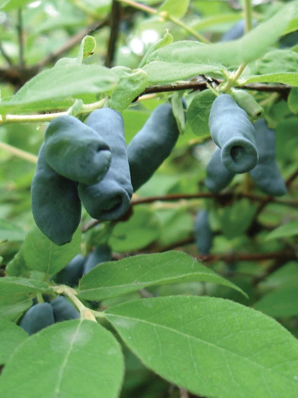 A member of the fragrant honeysuckle family and native to western North America, honeyberries ripen in early spring as 1″ blue-purple seedless berries. Berry flavor is noticeably similar to blueberries and is wonderful for fresh eating or making preserves. Honeyberries have a higher level of antioxidants than blueberries and are tolerant of most soils.