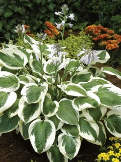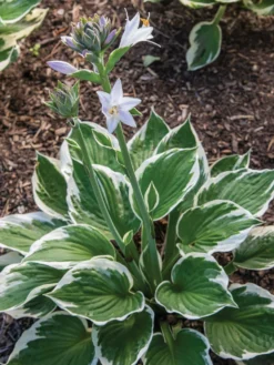 This variegated hosta is a very strong grower that will fill in to be a spectacular, broad plant. Bold, heart-shaped leaves with dark green centers and crisp white margins are slightly cupped and sure to brighten up a shade garden. Beautiful lavender flowers appear in summer, greeted by hummingbirds and butterflies. Slug resistant.