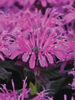 ‘Leading Lady Plum’ is a step ahead, blooming in early summer, well ahead of other bee balms. Forming smaller clumps than your average bee balm, this compact, low-growing 10-14” tall cultivar blooms right into midsummer. Bravura lilac-purple blossoms held by purple bracts float over densely branched plants with alluring, aromatic, dark-green foliage. Flower petals are prettily sprinkled with dark purple spots. Plants deliver two successions of blooms: once the first bloom begins to fade out, a new show of flowers grows above the first flowers. Great in the landscape or creating drama in a patio container. A surefire hit with frequent-flying butterflies, hummingbirds, and honeybees. Moderate tolerance to powdery mildew. Proven Winners USPP26447.