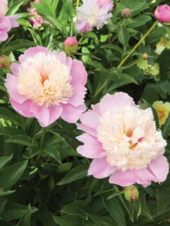 Peonies are standout stars of late spring. Welcome new hybrid variety is admired for striking pink and white, 5-7″ double blooms. Fragrant flowers enchant with large, colorful blooms and attractive green foliage that morphs into red when fall rolls around.