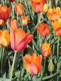 Hot, hot, hot! Swirling flames of color, ranging from deep orange to bright yellow, mingle together and seem to flicker as they age on the large flowers of this bright and bold tulip atop tall, strong stems. Petals flare slightly outward in a zestful gesture maximizing the color show. Single late, bulb size 12 cm and up.